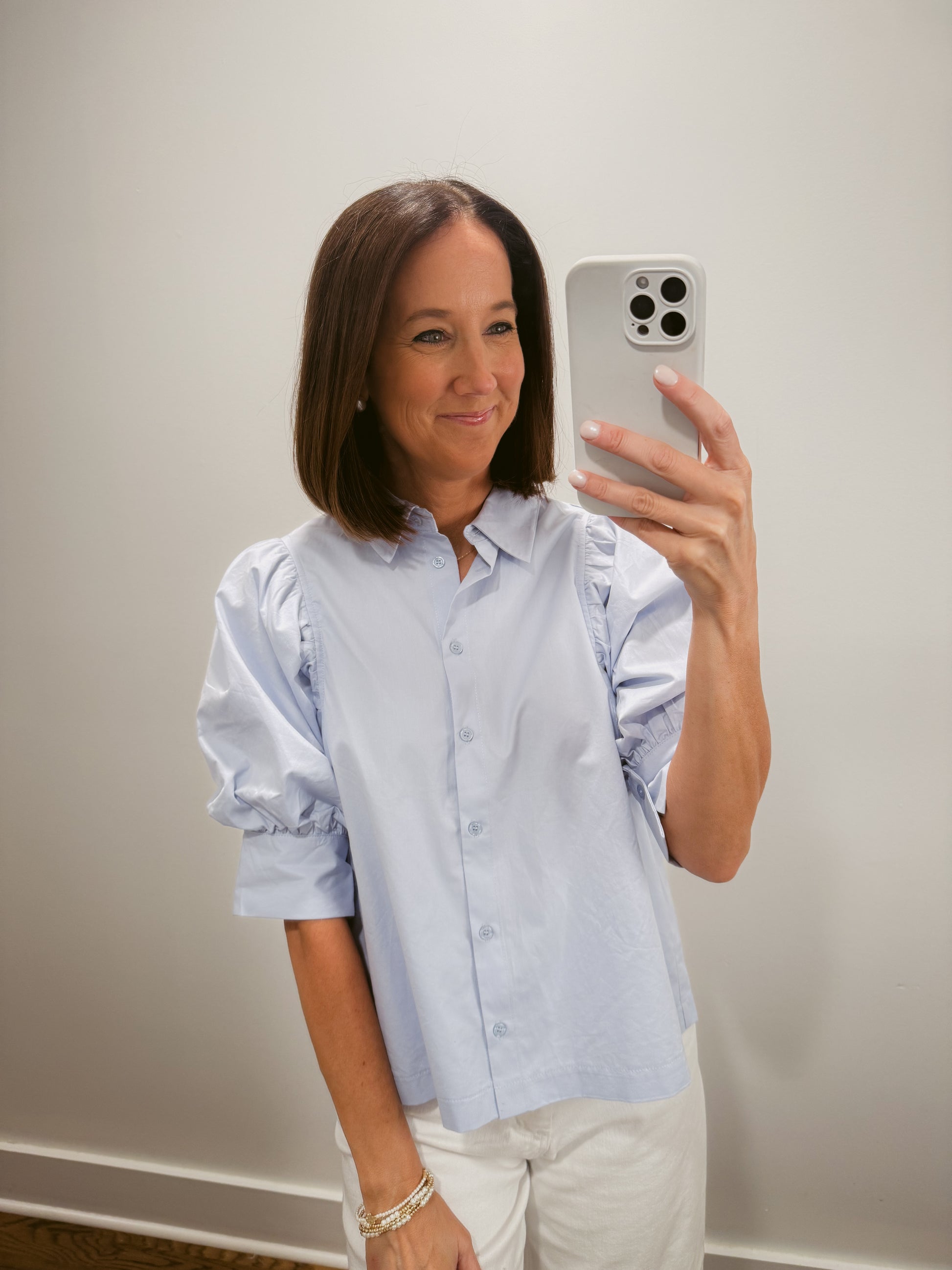 A classic top featuring puff sleeves and a button down placket. Designed with a timeless collar, wide buttoned cuffs, and a relaxed fit. In an always stylish blue shade, this top would pair beautifully with all kinds of pants and skirts!
